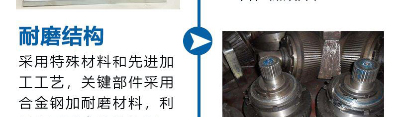 四、整機(jī)采用特殊材料和先進(jìn)連軸傳動裝置,關(guān)鍵部件采用合金鋼加耐磨材料,利用德國真空爐熱處理,使用壽命延長5-7倍。